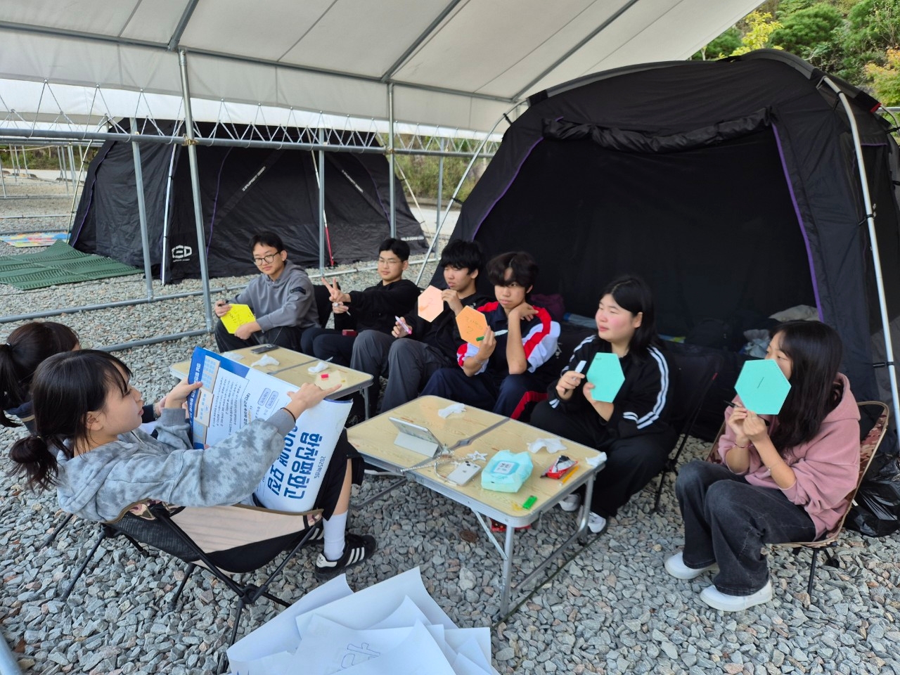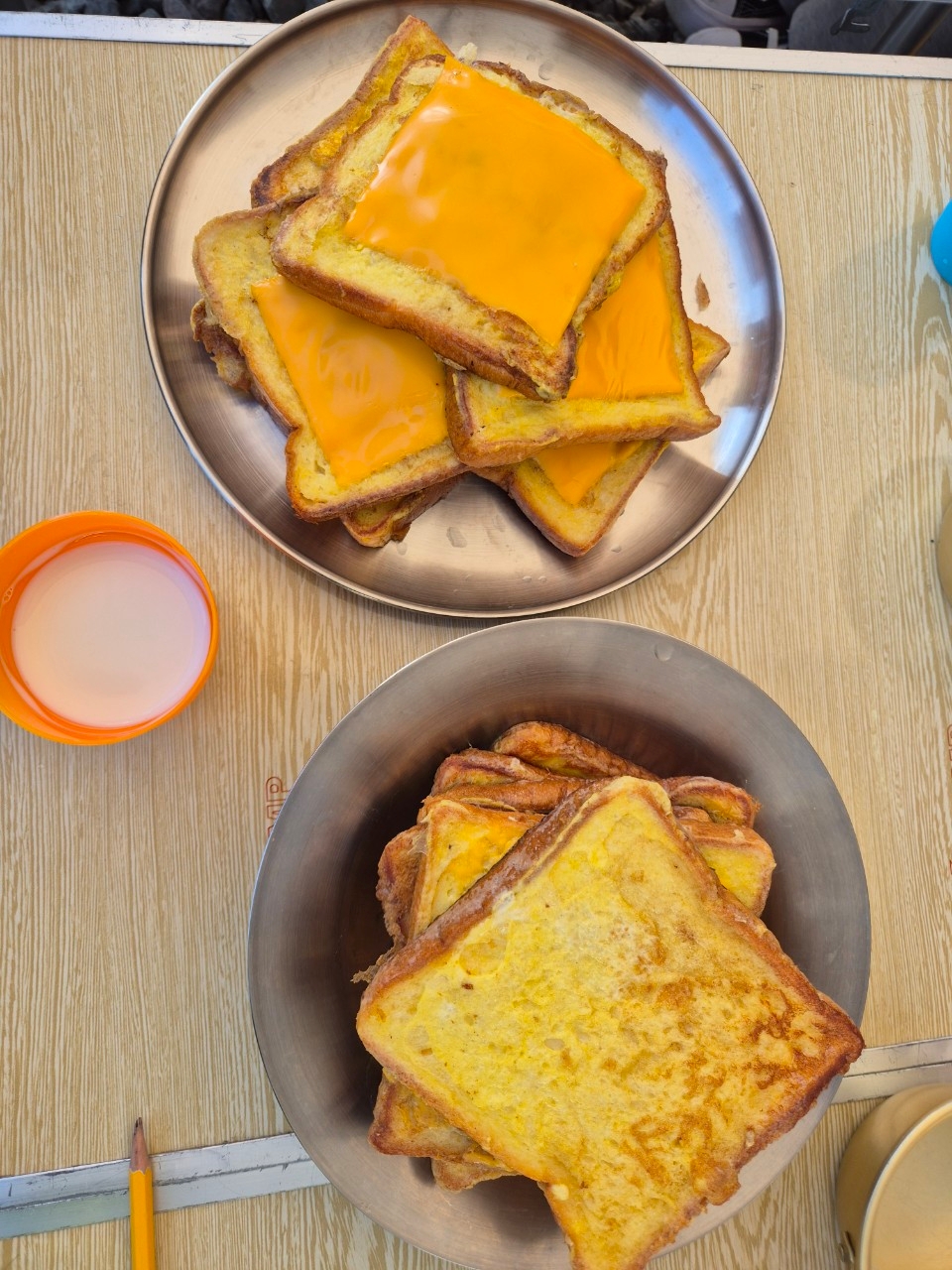 1학년 1조 캠핑조. 오늘 아침은.계란치즈.토스트와.우유, 오렌지주스.